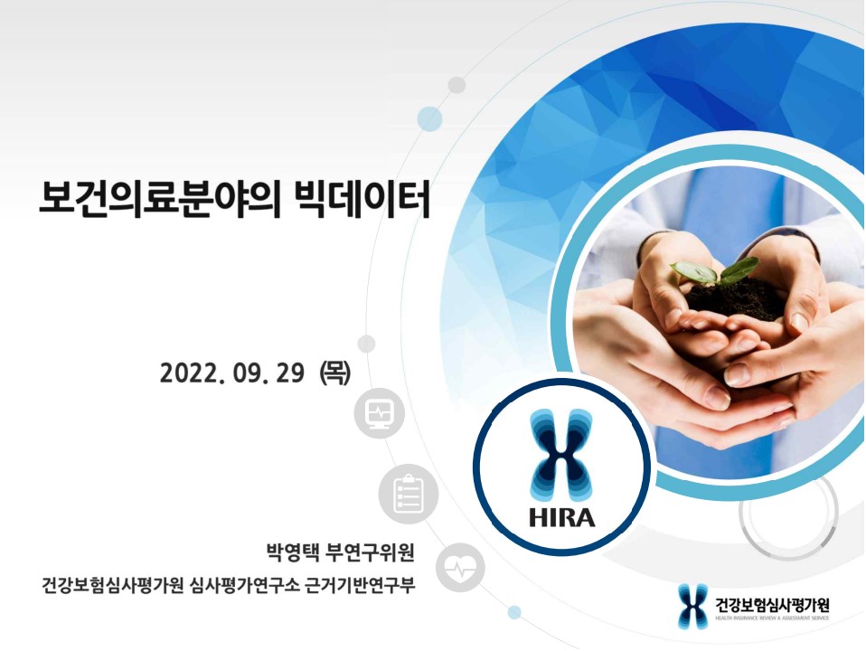 본 특강에서는 건강보험심사평가원장(정책연구실) 박영택 박사가 '보건의료분야의 빅데이터 분석방법' 이라는 주제로 강의하였습니다.