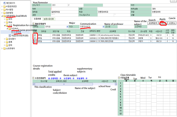 2. 2. Left Tab: Graduate Administration(대학원행정) – Course(수강) - Course Processing(수강처리) - Course Application(수강신청)