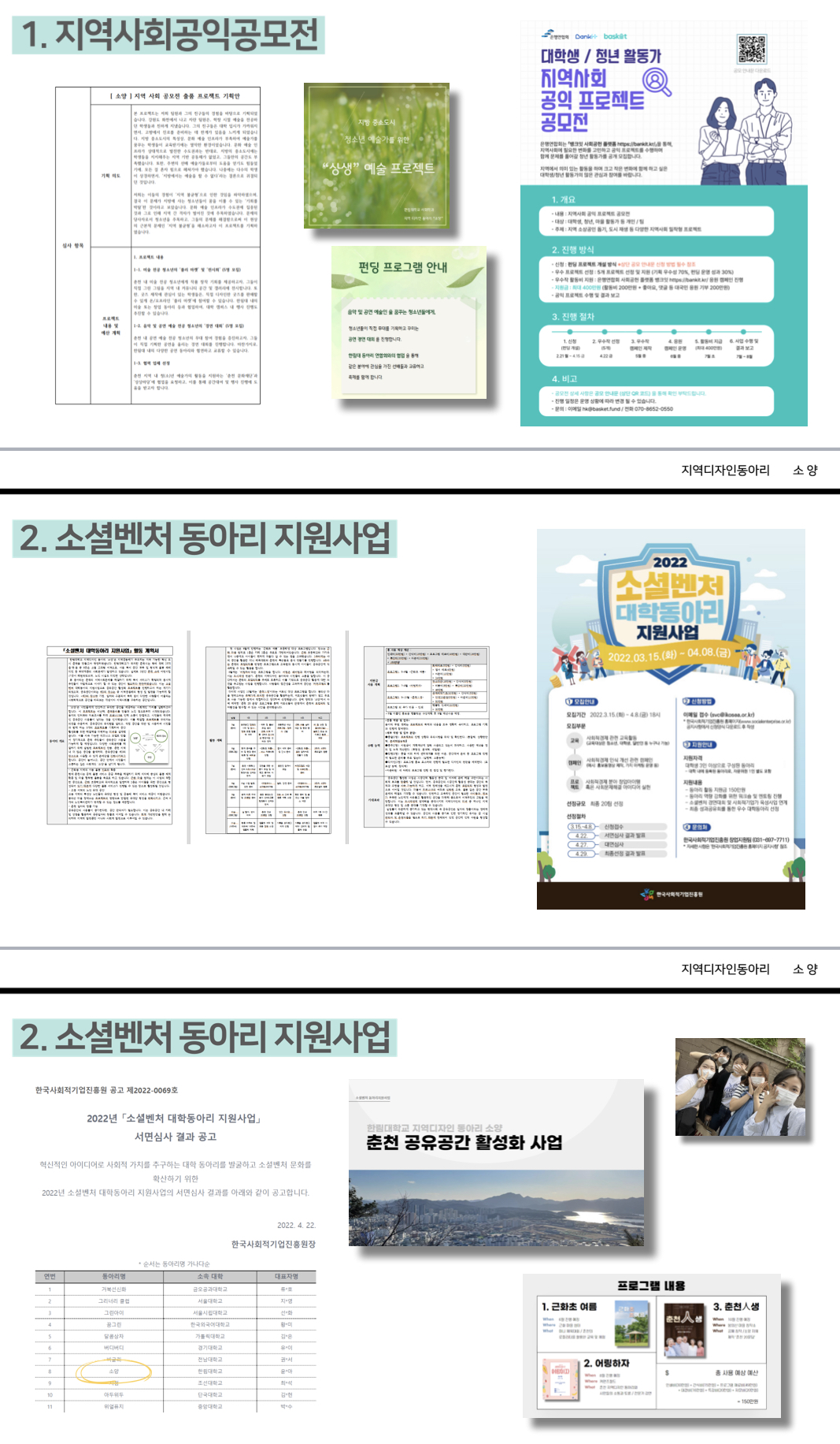 소양은 2021년 2학기부터 개설된 한림대학교 사회학과의 학술/지역디자인 동아리입니다. “소양”은 평소 닦아 높은 학문이라는 뜻의 소양과 한림대가 있는 춘천의 소양동에서 착안한 이름입니다. 지역사회 속에서 한국사회의 대안을 모색하고, 도시재생사업에 직접 참여하며 프로젝트 형식으로 사회적 가치를 추구합니다.